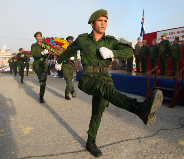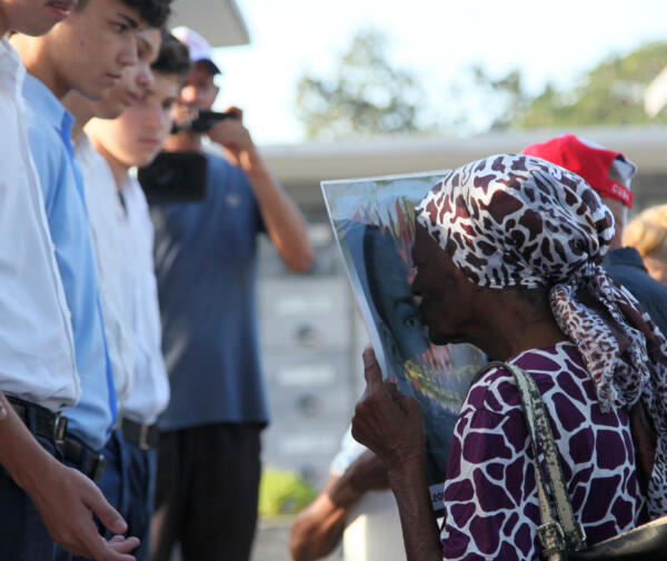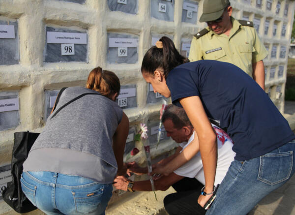 Mientras sonaba la marcha luctuosa, estudiantes espirituanos portaron retratos de los combatientes caídos y soldados y oficiales de las Fuerzas Armadas Revolucionarias depositaron cinco ofrendas florales en el Panteón donde reposan los restos de los internacionalistas.