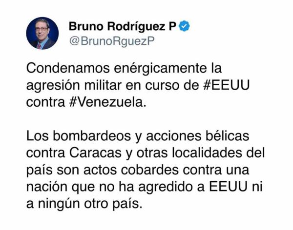 El canciller de Cuba Bruno Rodríguez, condenó este sábado la agresión militar en curso perpetrada por Estados Unidos en Venezuela mediante el uso de misiles.