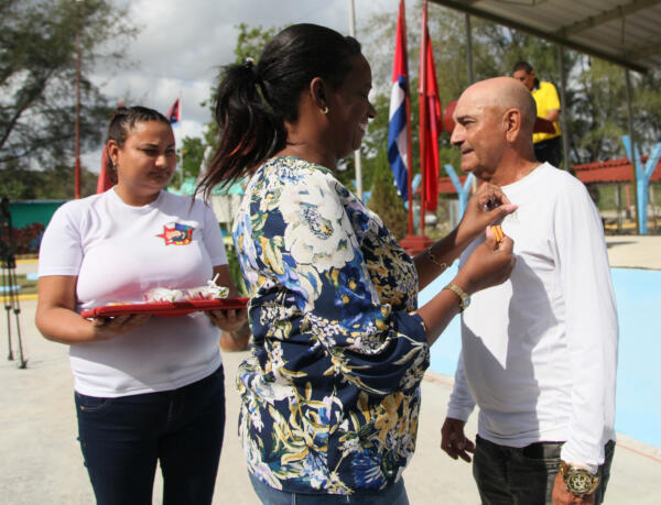 Deivy Pérez Martín (I) miembro del Comité Central del Partido Comunista de Cuba y su primera secretaria en la provincia, y Alexis Lorente Jiménez (D) entregaron reconocimiento a entidades y unidades destacadas del sector.