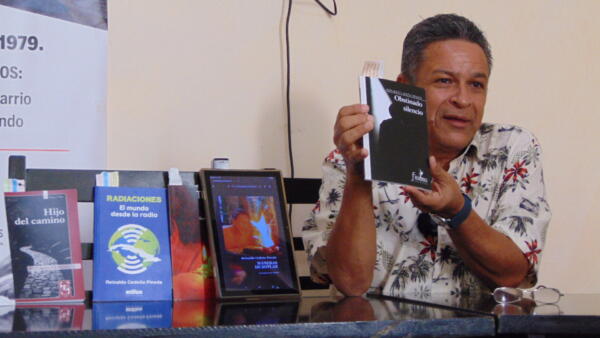 El periodista Reinaldo Cedeño expuso una reseña de sus obras en Pensamiento 2025 de manera atractiva y dinámica junto a los presentes. Foto: Dileán Sousa
