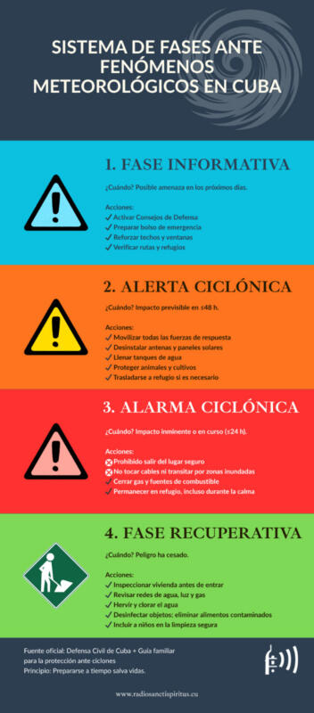 La Fase Informativa se declara cuando los órganos técnicos —especialmente el Centro de Pronósticos del Instituto de Meteorología— identifican la posibilidad de que un peligro (como una tormenta tropical, un sistema frontal, lluvias intensas o vientos severos) pueda afectar al país en los próximos días. En ese momento, se emite una nota oficial que especifica el tipo de amenaza y se activan los órganos de mando y dirección para situaciones de desastre a todos los niveles: nacional, provincial y municipal. Presididos por los primeros secretarios del Partido Comunista en cada territorio, estos Consejos de Defensa inician la movilización de los recursos humanos y materiales previstos en los planes correspondientes, y puntualizan las medidas de aseguramiento en sectores vitales como salud, energía, abasto de agua y transporte.