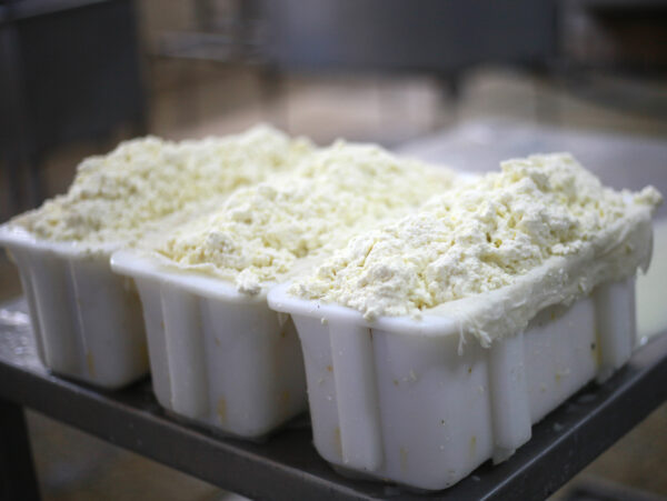 Cuando hay suficiente leche en los depósitos comienza el proceso de cortado para elaborar queso.