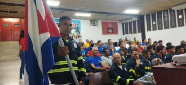 El contingente eléctrico Serafín Sánchez Valdivia de Sancti Spíritus fue abanderado por autoridades de la provincia antes de partir rumbo al oriente del país. Foto: Yosdany Morejón