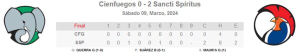 Sancti Spíritus anotó dos carreras, disparó 8 hits, con dos dobles a la cuenta de Alexis Miguel Varona y del máscara espirituano Yadiel Guerra, mientras la segunda carrera la impulsaba con incogible Alejandro Escobar.