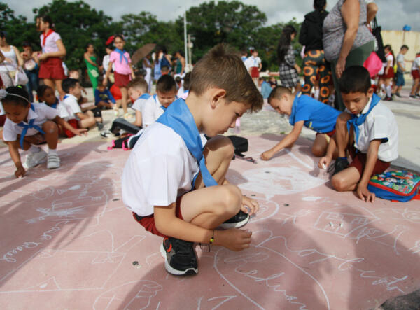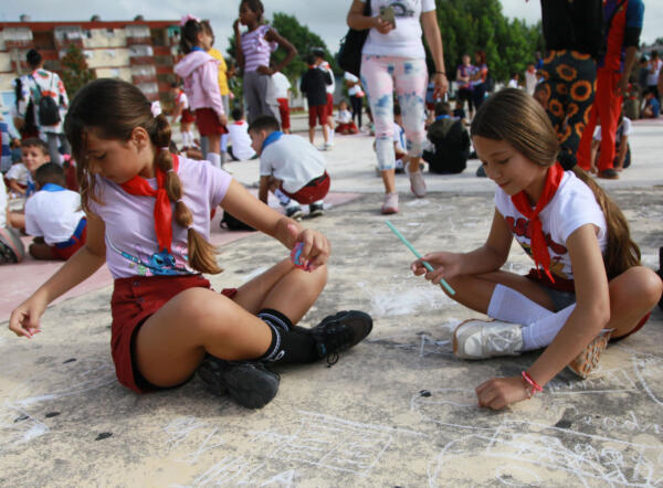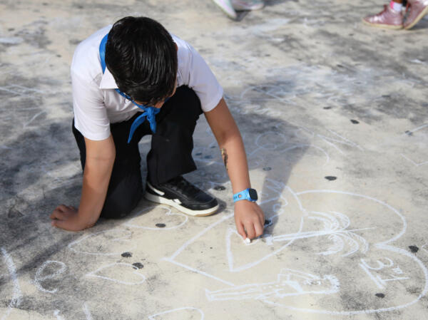 Con sus dibujos sobre el cemento, los pioneros saludaron el cumpleaños de su organización.