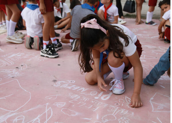 Con sus dibujos sobre el cemento, los pioneros saludaron el cumpleaños de su organización.