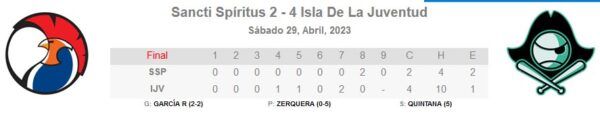 Con este resultado, Sancti Spíritus se mantiene en el octavo lugar, compartido con Mayabeque, pero a cuatro juegos del puntero Santiago de Cuba, al tiempo que La Isla avanzó hasta la quinta plaza a dos escaños del líder.